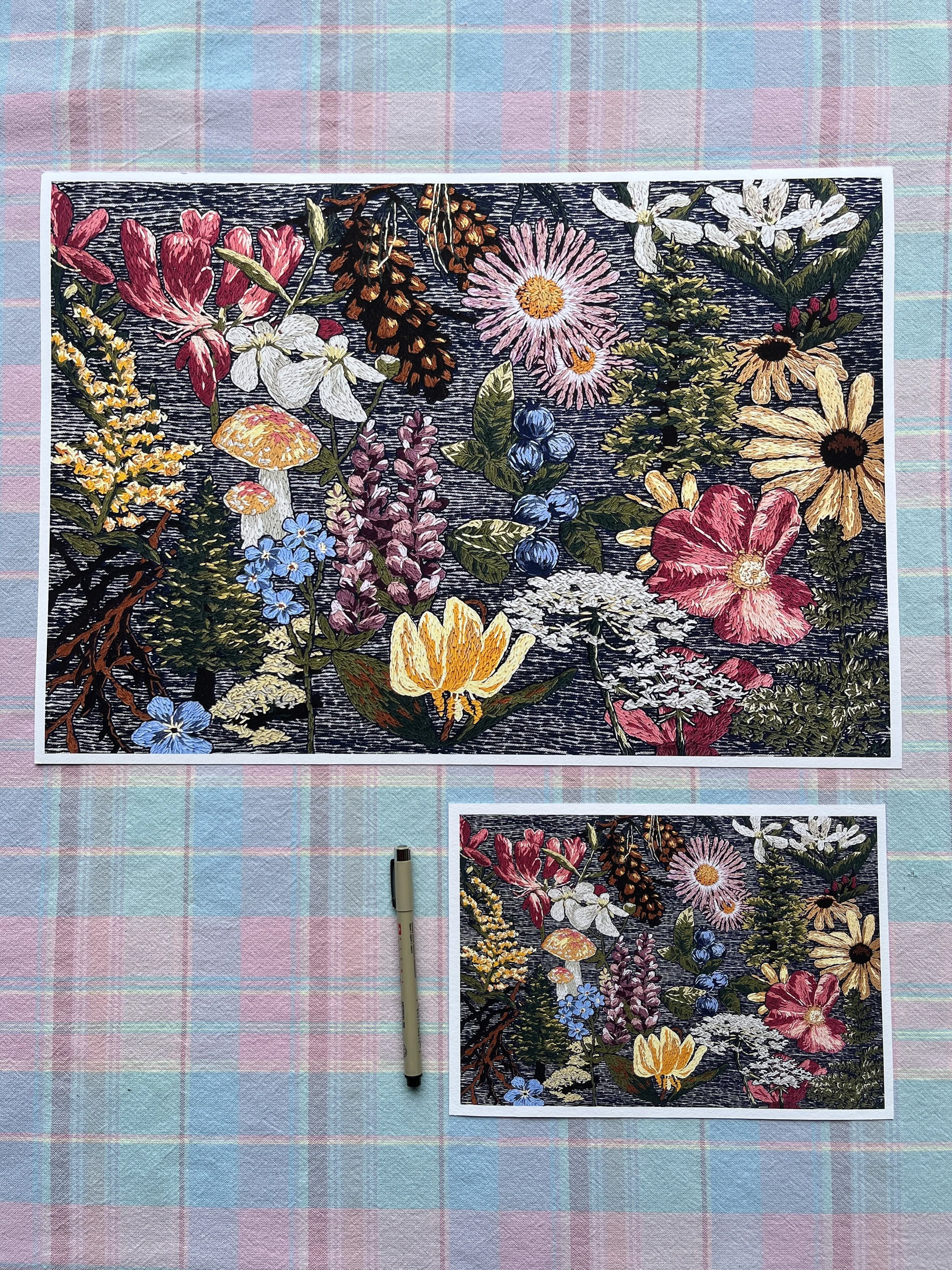 The 14-by-20 size is the same size as my original embroidery, so the textures feel true to life and many of the plants appear almost their original size. Perfect for adding color, beauty, and a reminder to look closely to any spot in your home.